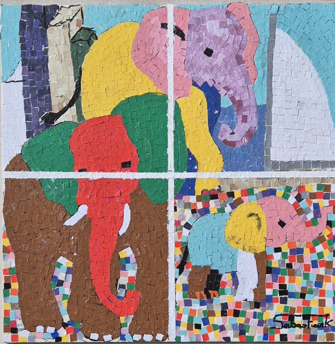 Mi avvicino ulteriormente alla superficie del mosaico, quasi a voler sentire il respiro delle tessere. Non guardo più l'insieme, ma punto il dito verso un dettaglio che quasi sfugge all'occhio distratto dal tripudio di colori: la zona in basso a sinistra, dove le gambe dell'elefante marrone poggiano su un suolo fatto di frammenti impazziti. L'Analisi del Dettaglio Nascosto: "Fermatevi. Guardate qui, dove il peso della bestia incontra la terra. Vedete questa mescolanza di tessere bianche, nere, rosse e blu? Sembra un errore, un avanzo di bottega gettato a terra. Ma è qui che risiede il segreto della forza dell'opera." Il Sublime non può esistere senza il disordine da cui nasce. Sebastiank ha posto la stabilità dell'elefante sopra un tappeto di incertezza. Quelle tessere sparse sono il mondo che urla, la Dubai frenetica, il rumore del mercato e della finanza. Ma guardate come l'elefante calpesta quel caos con una grazia pesante. In quel punto ha usato ogni scarto. Ogni pezzetto che non trovava posto nel 'disegno' perfetto degli elefanti è finito lì sotto. Ed è proprio lì che l'opera diventa terribile e quindi eccelsa. La grandezza non sta nel dipingere solo il bello, ma nel mostrare come la bellezza riesca a stare in piedi sopra la confusione. L'elefante non ignora il caos: lo domina usandolo come base. Quei quadratini multicolore sono le 'mille passioni' dell'uomo; l'artista le ha cementate per dare una strada alla Famiglia Dumbo. Invito a osservare un altro elemento quasi invisibile: il sottile spazio bianco tra le unghie degli elefanti e il suolo. Notate come l'elefante sembri quasi fluttuare di un millimetro sopra la confusione? È la distanza che l'anima deve tenere dalle cose terrene. Anche senza smartphone, Dumbo non si sporca con il rumore del mondo; lo attraversa. Nell'angolo più buio, c'è una singola tessera blu elettrico. "Quella, "è la scintilla dell'intuizione. È il ricordo del cielo che l'elefante porta con sé anche mentre cammina nella polvere." Molti guardano la proboscide rossa perché è vistosa, ma la verità del Sublime è in questo basamento. È il trionfo della forma sul disordine. È la prova che si può camminare nel carnevale più chiassoso del mondo rimanendo integri, pesanti di dignità e leggeri di spirito." L'opera non celebra solo la famiglia, ma la capacità di restare uniti mentre il suolo sotto i piedi è un mosaico di incertezze. Mentre gli altri elefanti hanno colori pastello, quasi sognanti, Dumbo brandisce una proboscide di un rosso ancestrale. Osservate la curva di questo arto. Non è una semplice parte del corpo, è una fiammata di volontà. È il Pathos. In questa proboscide, Sebastiank ha racchiuso tutto il desiderio di comunicazione che non passa attraverso un cavo a fibre ottiche. Guardate come si arriccia verso il basso, quasi a voler toccare quella confusione di tessere colorate di cui parlavamo prima. È l'unico punto dell'opera in cui il colore è puro, violento, senza sfumature." Notate la punta della proboscide: è rivolta verso l'interno, verso il sé. In un mondo (Dubai) che spinge tutto verso l'esterno, verso l'ostentazione, questa proboscide è un gesto di raccolgimento. È l'organo che permette di 'annusare' il sacro senza bisogno di algoritmi. Il Ritmo del Cuore: Il rosso è disposto in file verticali che sembrano muscoli tesi. È l'unica parte del mosaico che trasmette una sensazione di movimento muscolare reale. Il Contrasto col Marrone: "Il corpo è terra (marrone), ma il respiro è fuoco (rosso). L'artista ci dice che anche se siamo fatti di fango, ciò che usiamo per interagire con il mondo deve essere ardente."L'Assenza di Bocca: "L'elefante non parla, perché il Sublime non ha bisogno di parole. La proboscide rossa è la sua lingua, il suo grido, la sua preghiera. Questa proboscide è il vero 'ponte' dell'opera. Se la togliessimo, l'intero quadro diventerebbe una decorazione da salotto. Con questo rosso, invece, diventa una sfida. È il segno di chi non ha credito in banca, ma ha un credito infinito di vita nelle vene. Le Zanne: Il candore della Verità. Guardate queste zanne. Sono di un bianco accecante, quasi estraneo al resto della tavolozza. In un mondo di specchi e riflessi come quello di Dubai, queste zanne non riflettono nulla. Esse sono luce pura. Perché rappresentano la Franchezza (parrhesia). Il Sublime richiede verità. Quelle zanne sono le armi di chi non ha bisogno di difendersi con la violenza, ma con la propria purezza. Senza carta di credito, la loro unica ricchezza è questo avorio spirituale, questo segno di maturità che sorge dal rosso della passione. Il Colore della Vulnerabilità dell'elefante in alto. Osservate questo rosa. Non è il rosa della vanità, ma il colore della pelle nuda, dell'intimità esposta. In un mondo di acciaio e vetro come Dubai, Sebastiank ha dipinto il gigante come una creatura di estrema tenerezza. Il Sublime qui non è nella forza bruta, ma nella grandezza della fragilità. È un elefante che ha il coraggio di essere 'morbido' in una città dura. La Proboscide-Cascata: "Notate come la sua proboscide cada verso il basso con la grazia di una colata di seta. Non sta afferrando nulla, non sta accumulando. È l'immagine della Gratuità. Senza smartphone, questo gigante non deve catturare immagini; si limita a esistere, riempiendo lo spazio con la sua benevola presenza. L'Occhio dell'Elefante Rosa: Il buco nero della Coscienza Punto poi l'indice verso il piccolo quadrato nero che funge da occhio per il grande elefante rosa in alto. Ecco il punto di fuga di tutta l'opera. Molti pensano che il Sublime sia luce, ma esso è anche Oscurità abissale. Quell'occhio non sta guardando il Carnevale; sta guardando dentro di noi. È una singola tessera nera che bilancia tutto il rosa e il giallo del mondo. Sebastiank voleva che fosse uno sguardo che non chiede nulla, a differenza delle telecamere di sorveglianza che ci circondano. Proprio così. Quell'occhio è il silenzio di Dio nel de